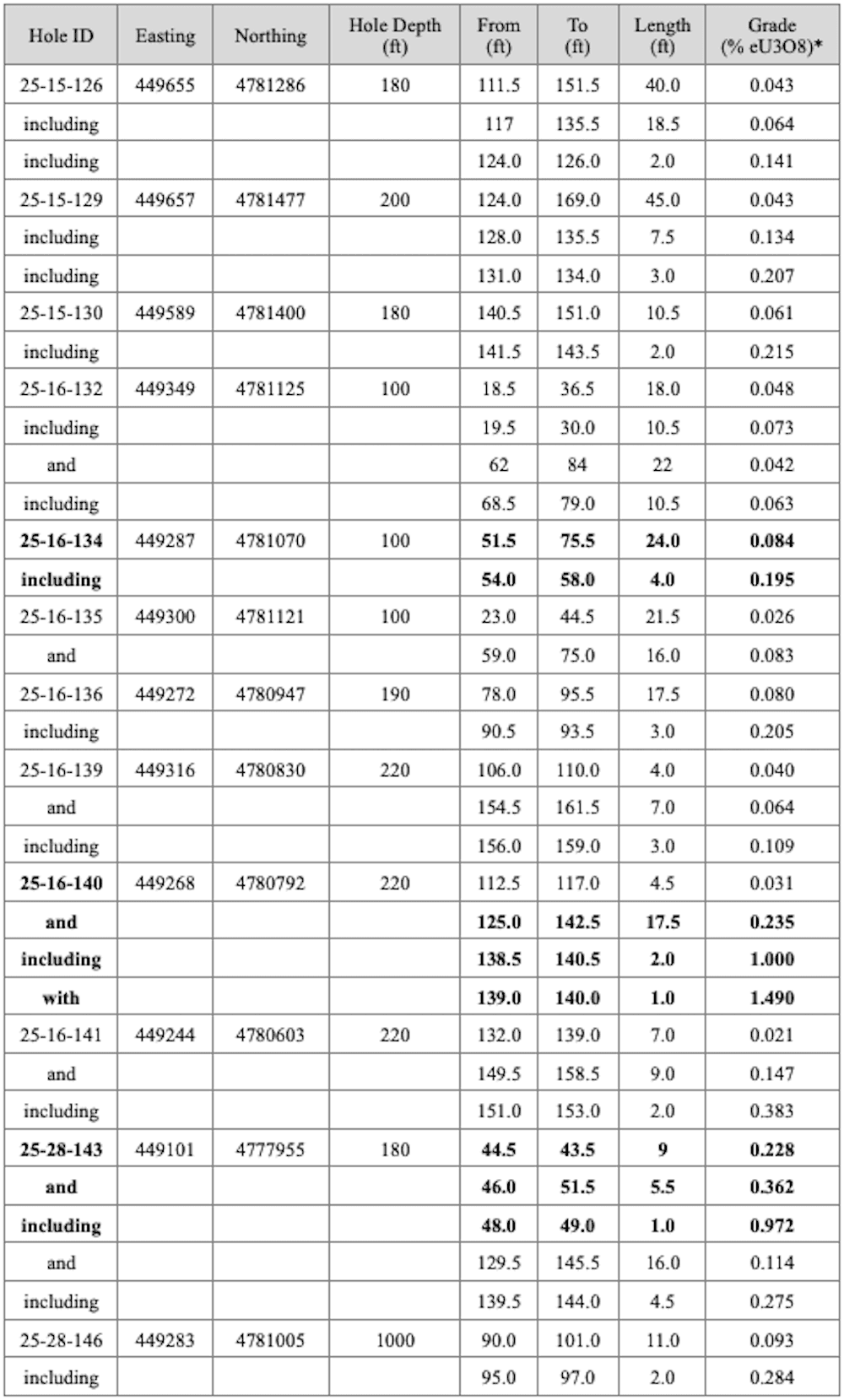 The final holes were drilled toward the northern end of the historic uranium trend and continue to demonstrate strong continuity of mineralization. Importantly, several of the strongest intercepts of the entire program came from this area, providing geological support for the continuation of the system onto the Company’s recently staked northern claims toward known uranium resources held by Uranium Energy Corp.