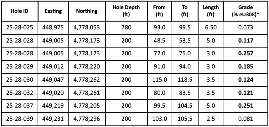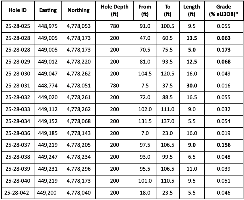 Of special note, hole 25-28-028 intersected two zones, the first with 13.5 feet of 0.063% eU308 including 5.0 feet of 0.117% eU308 and the second zone of 5.0 feet of 0.173% eU308 included 3.0 feet of 0.257% eU308. Hole 25-28-29 intersected 12.5 feet of 0.068% eU308, including 3 feet of 0.185% eU308 and hole 25-28-037 intersected 9.0 feet 0.156% eU308, including 5.0 feet of 0.251% eU308.