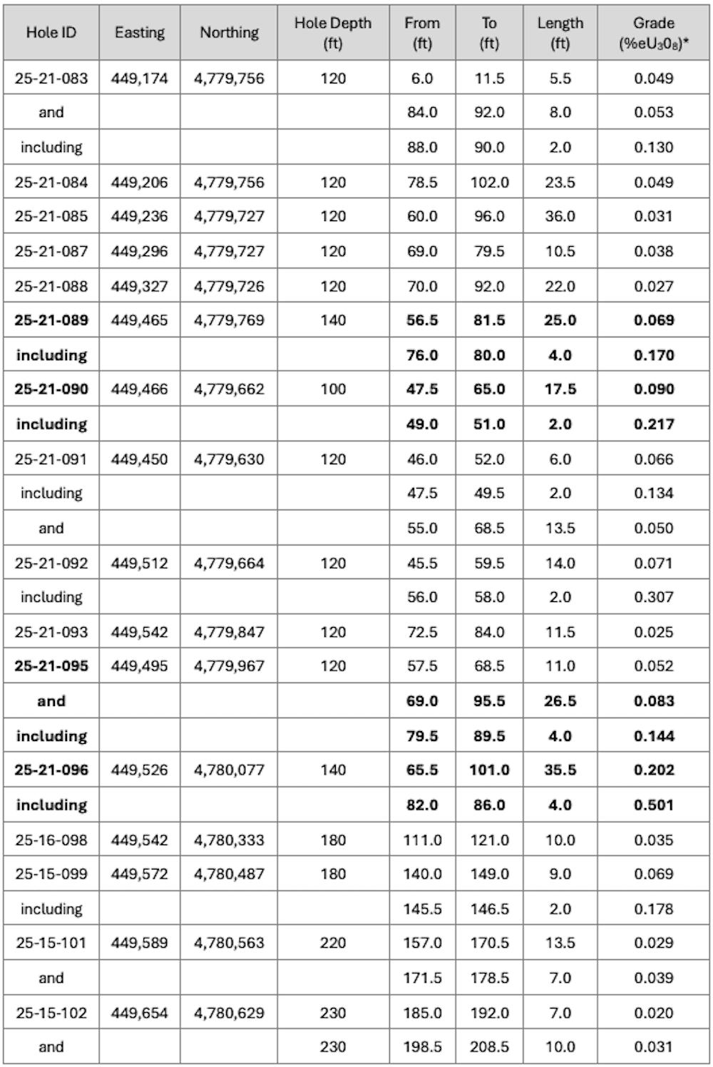 * The geophysical results are based on equivalent uranium (eU308) of the gamma-ray probes calibrated at the Department of Energy’s Test Facility in Casper, Wyoming. A geophysical tool with gamma-ray, spontaneous potential, resistivity, and drift detectors was utilized. The reader is cautioned that the reported uranium grades may not reflect actual concentrations due to the potential for disequilibrium between uranium and its gamma emitting daughter products. The drill results were determined using thickness and grade % cutoffs of 2-ft, 0.02% eU308 and GT >0.2.