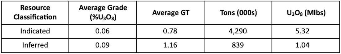 1. Based on grade cutoff of 0.020% eU3O8, a grade x thickness (GT) cutoff of 0.20 GT and a one-foot minimum intercept thickness.